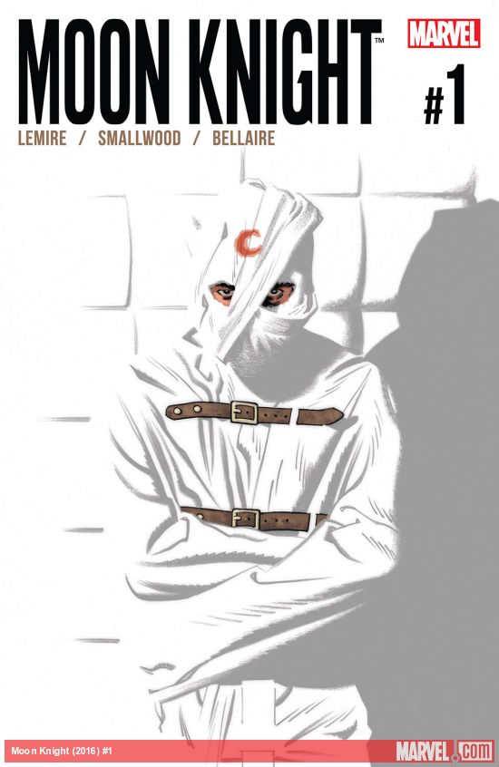 THE BOOK YOU’D BE INSANE TO MISS! Marc Spector (a.k.a. Moon Knight/Jake Lockley/Steven Grant) has been fighting criminals and keeping New York City safe for years… or has he? When he wakes up in an insane asylum with no powers and a lifetime’s worth of medical records, his whole identity (indentities) are called into question. Something is wrong, but is that something Marc Spector himself? Jeff Lemire (EXTRAORDINARY X-MEN) and rising star Greg Smallwood are calling everything you know about Moon Knight into question.